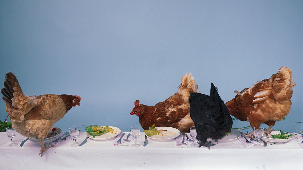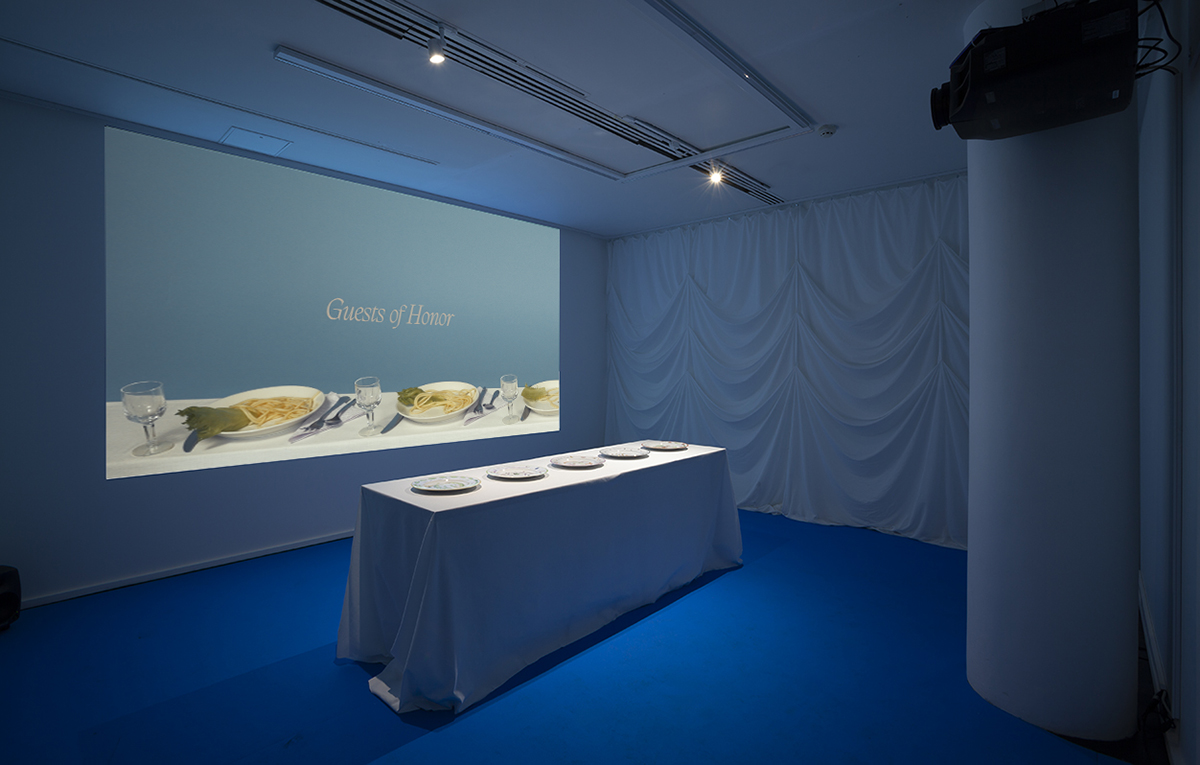 Installation view from Heino Gallery december 2024. In addition to the video a series of porcelain plates "for the guests of Honors", describing meals that could be served to chicken, were exhibited.